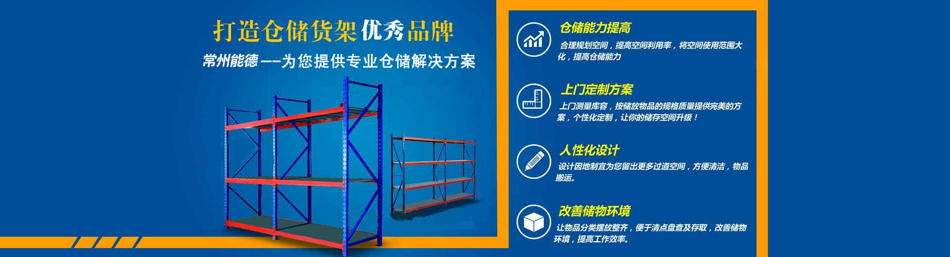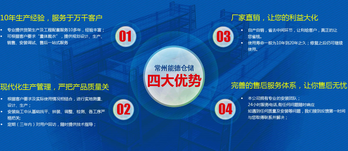 常州市能德仓储设备有限公司是一家集研发,设计及生产加工的货架生产厂商。公司以精益求精的态度制做货架、模具架、工作台、仓储货架、周转器具、储物器具(轻、中、重型货架、阁楼货架、抽屉式货架、移动式货架、悬臂式货架、超市货架、工位器具、托盘、仓储笼、周转箱、手推车、密集柜、工具车、登高车、工作台、储物柜、铁床)。公司具有从仓储总体规划设计、型材轧制、生产检验、表面涂装至安装调试、售后服务等服务的综合能力。