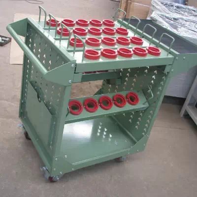 刀具车是存放、搬运刀具的装备,现代货架厂生产的HY-HSK系列刀具车成多边成型的前后侧板上有模数化的人字孔,可将刀具座挂板按水平或倾斜放置,方便多种刀具的存放。 高强度脚轮,车前为两个定向轮,车后为两个万向带 刹车轮,推行平稳,方向性好,刹车固定后不会滑动。